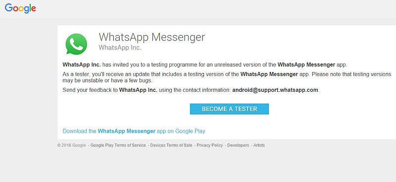On opening the page, a message shows up saying, "WhatsApp Inc. has invited you to a testing programme for an unreleased version of the WhatsApp Messenger app."